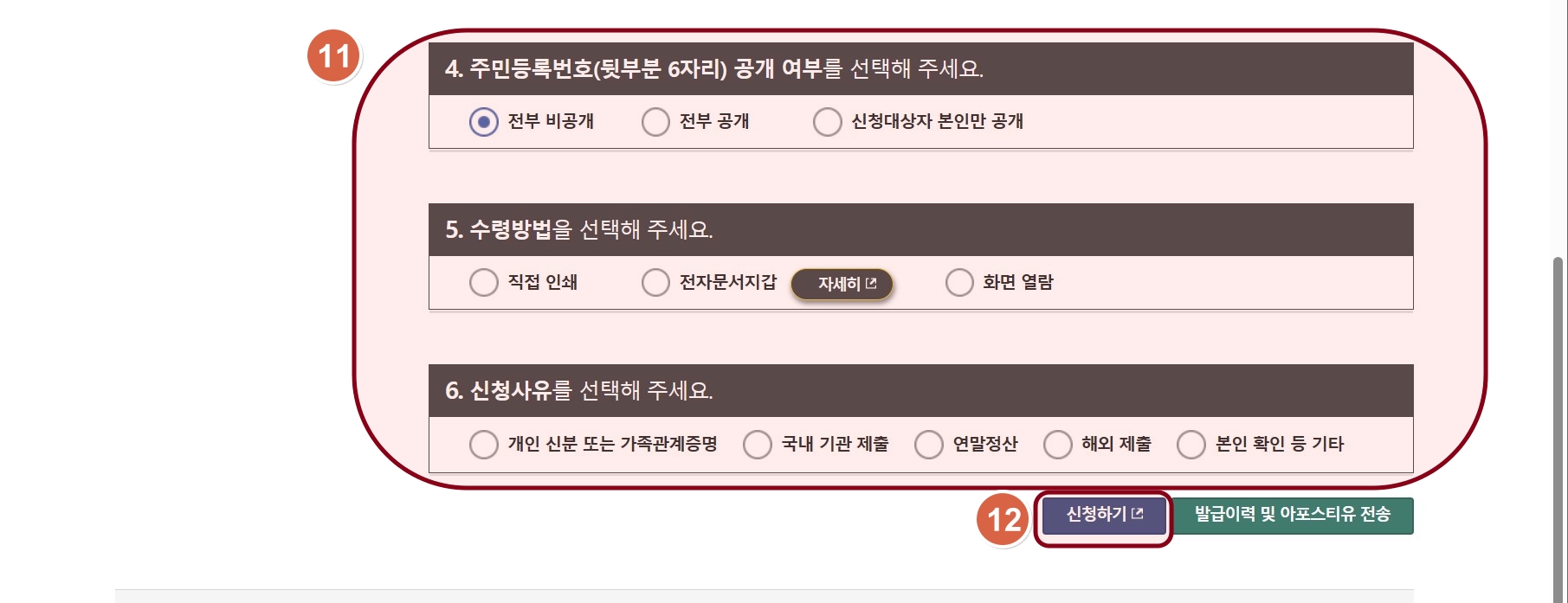 11~12. 주민등록번호 뒷자리 공개 여부를 선택합니다.