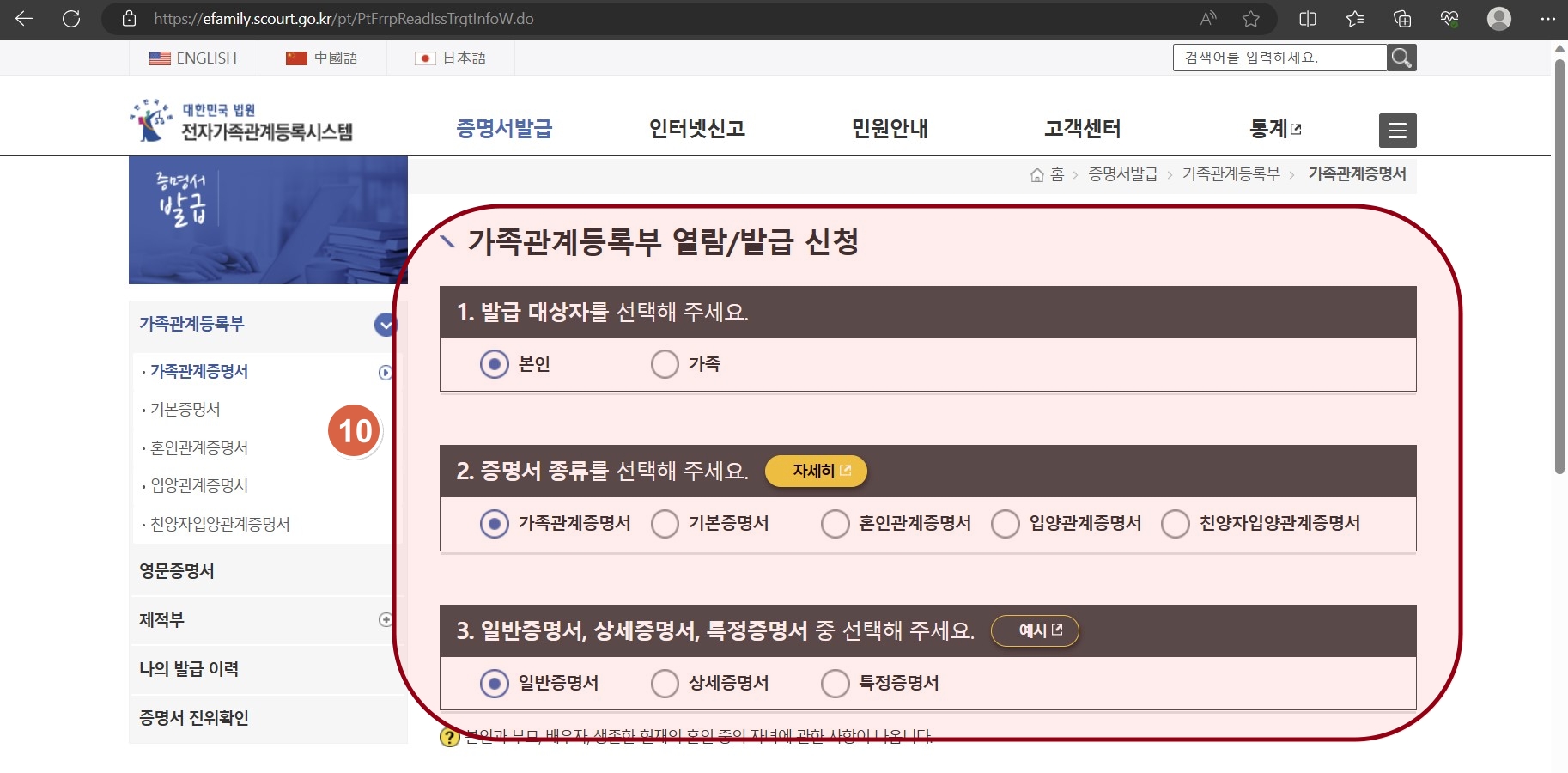 -증명서 종류에는 ‘가족관계증명서’를 체크합니다.