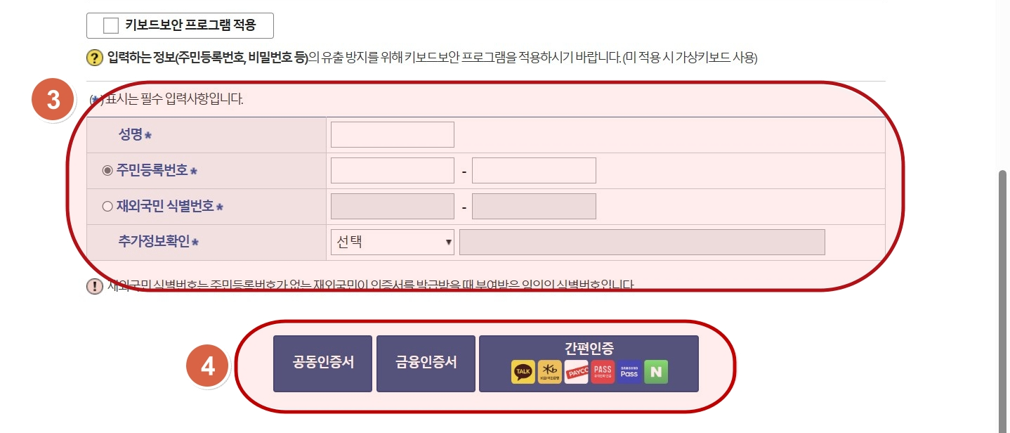 발급 받는 사람의 성명, 주민등록번호,추가정보확인을 입력한 후 공동인증서, 금융인증서, 간편인증 등으로 인증을 받습니다. (저는 간편 인증을 한본 해보니 제일 쉽고 편해서 간편인증이 되는 곳이라면 간편인증을 이용합니다.)